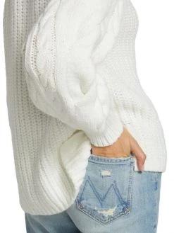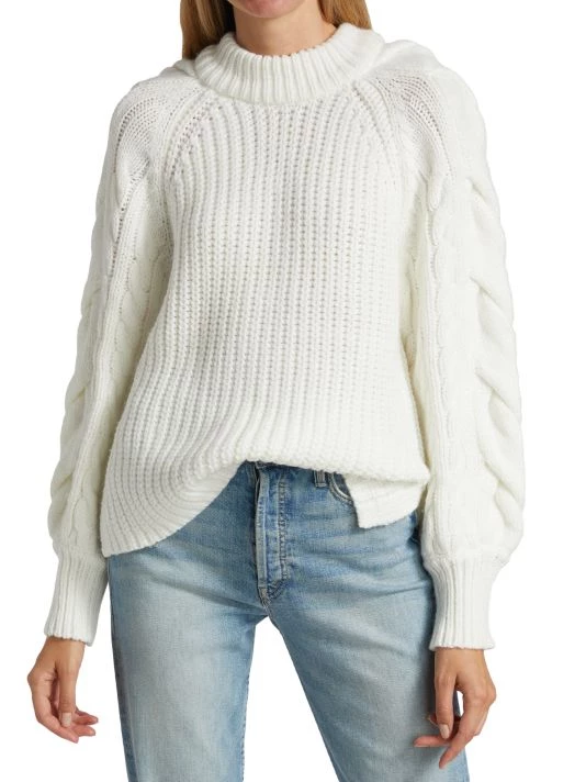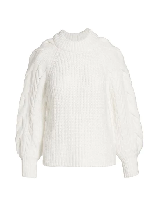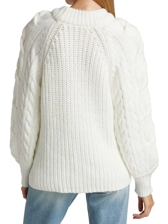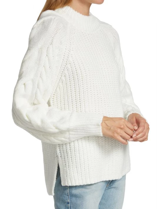 This modern sweater is cut with a mock neck and raglan-style sleeves, spun with cable-knit designed at sleeves.