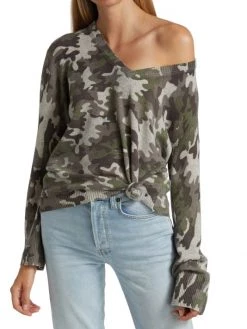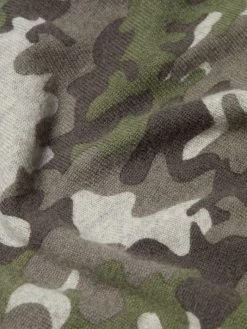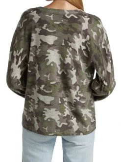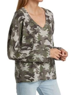 Cozy cashmere sweater boasts a camo pattern, featuring a traditional V-neckline and rib-knit trim.