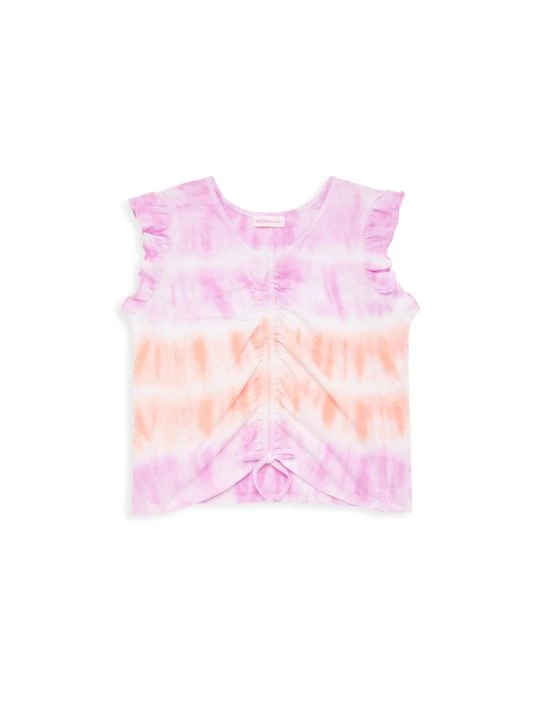 A ruched front shapes this sweet tie-dye top, designed with ruffle trim and bright coloring.