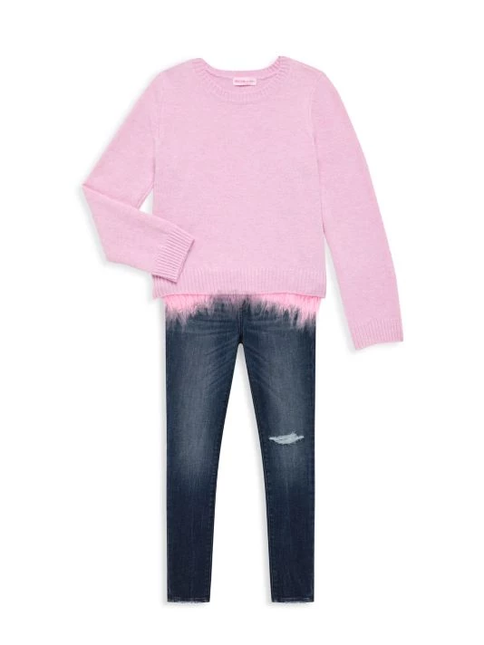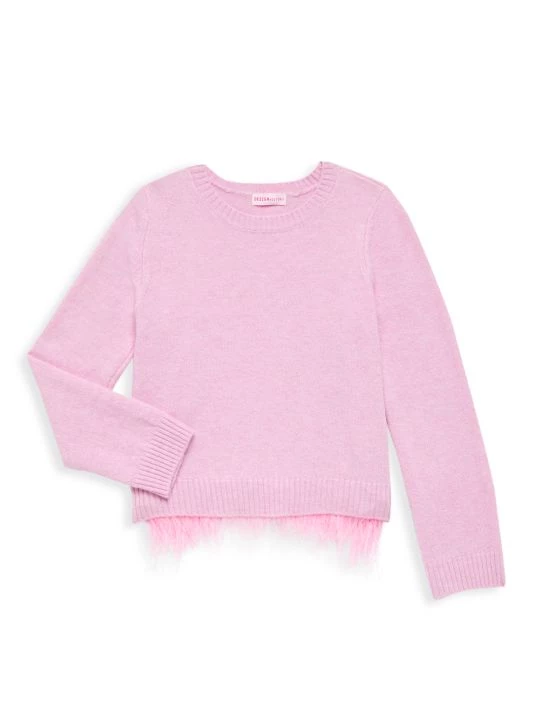 This crewneck sweater in a rib-knit is adorned with faux feather trim at the hem.