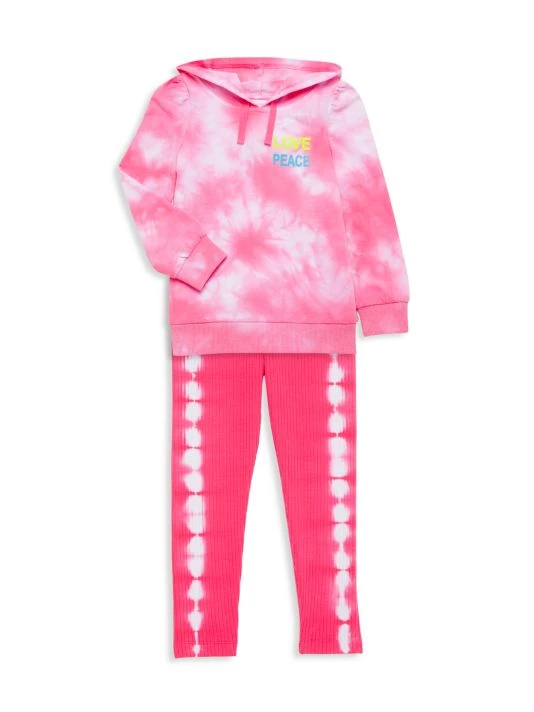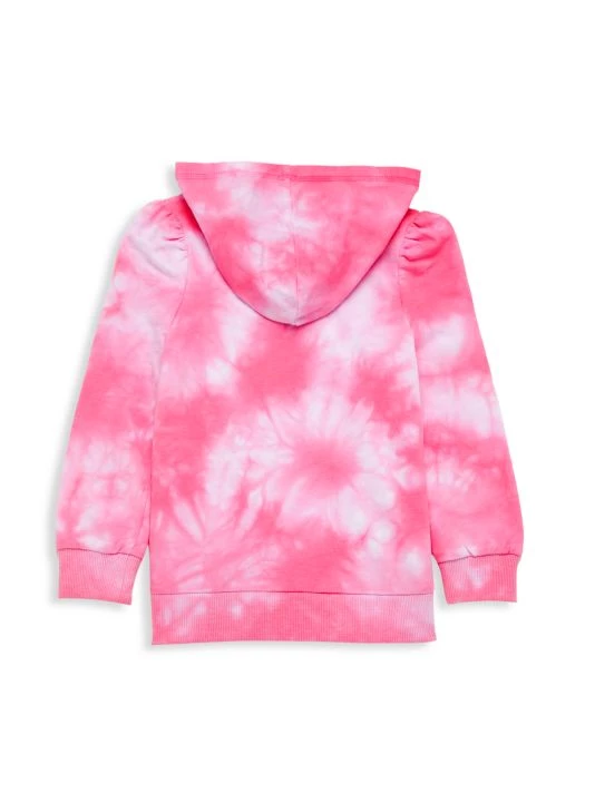A classic-style sweatshirt in a tie-dye pattern features a graphic at the chest and a drawstring hood.
