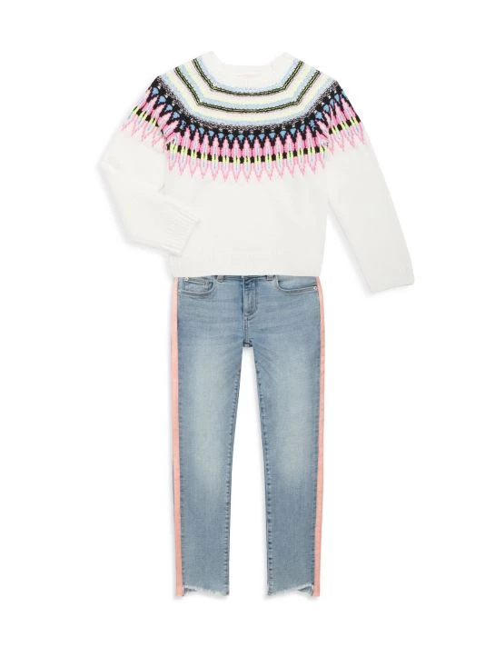 This classic crewneck pullover sweater features a colorful neon motif radiating from the neckline.