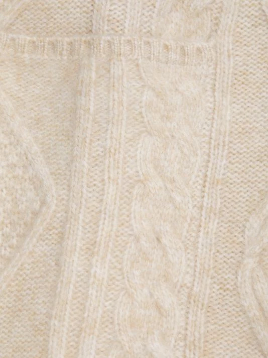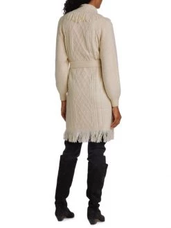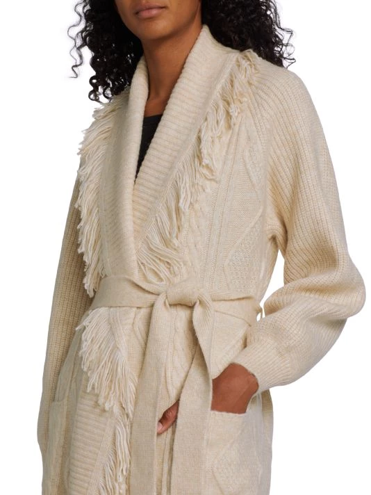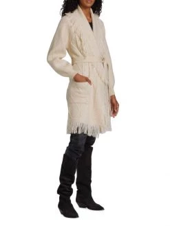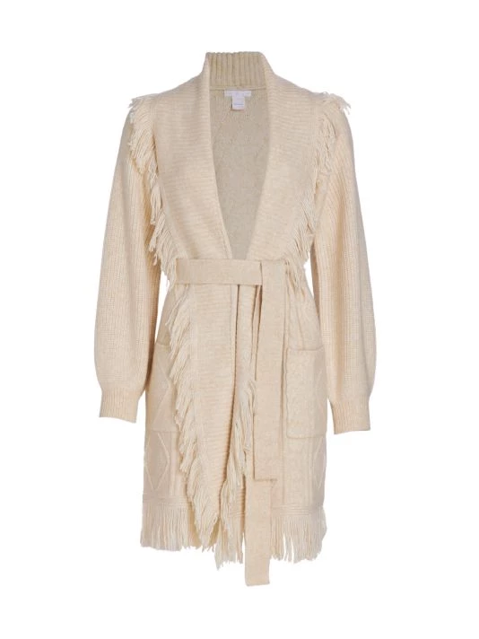 Fringe trims Design History’s long cardigan, knit with textural patterning to a robe silhouette.