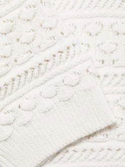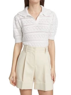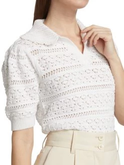 This knit polo sweater features playful puff sleeves and patterned openwork detailing.