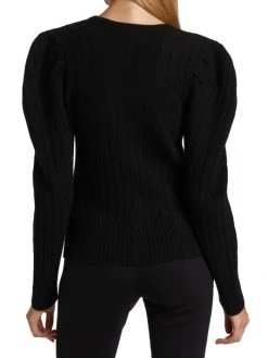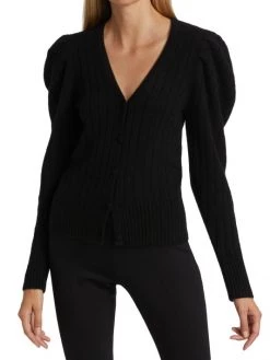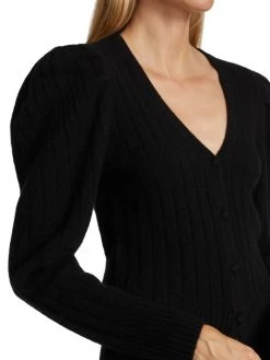 Cozy cashmere cardigan with traditional button closure, framed with romantic puff-sleeves.