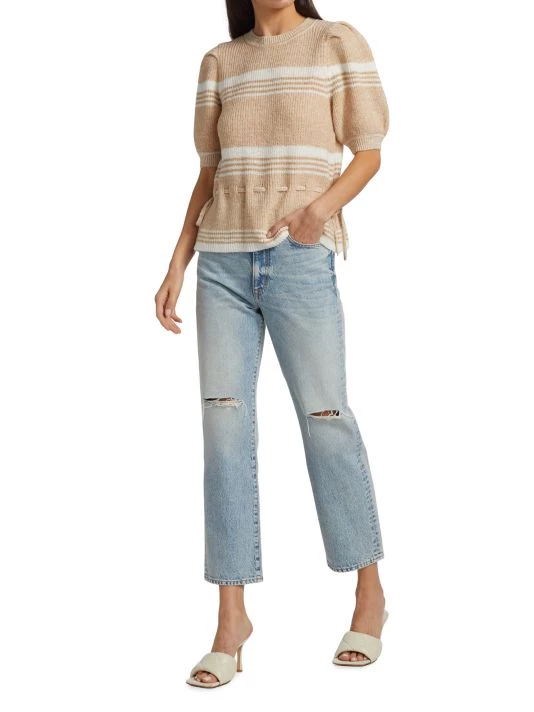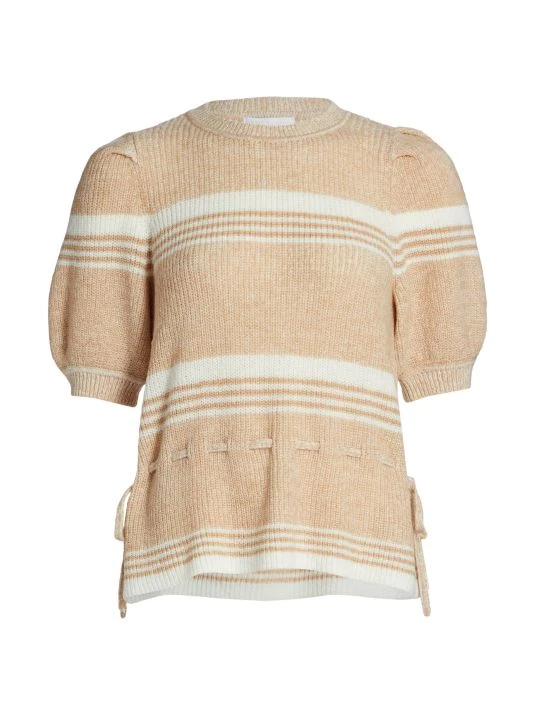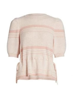 Crochet pullover sweater with feminine puff sleeves and adjustable self-tie sides for a form-fitting silhouette.