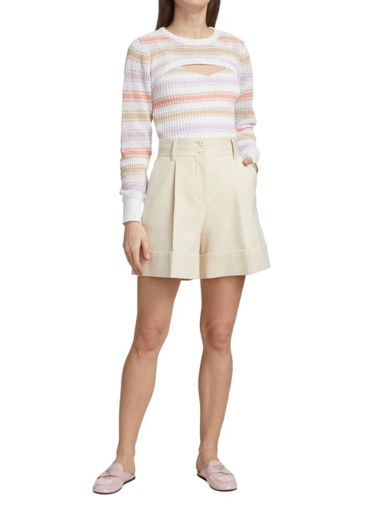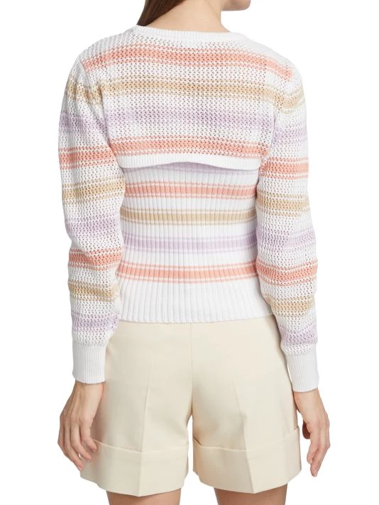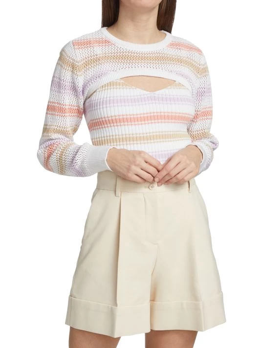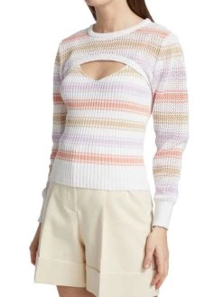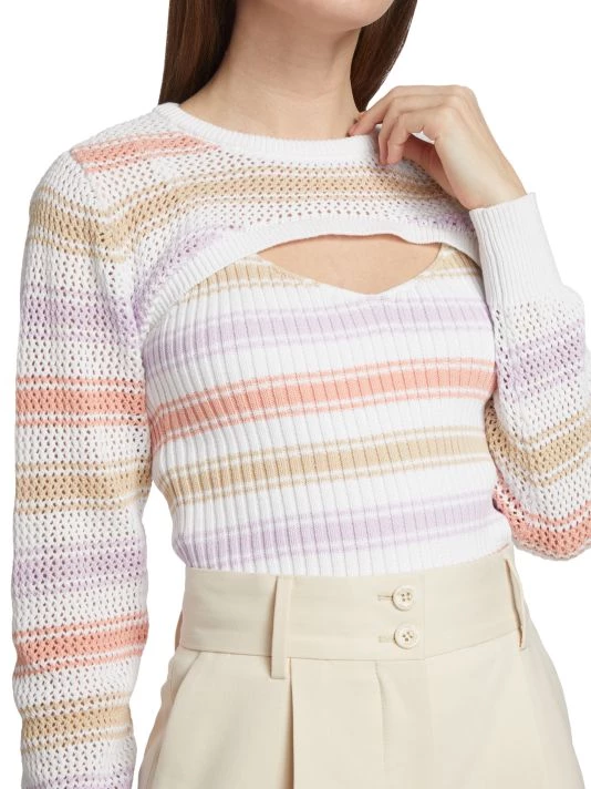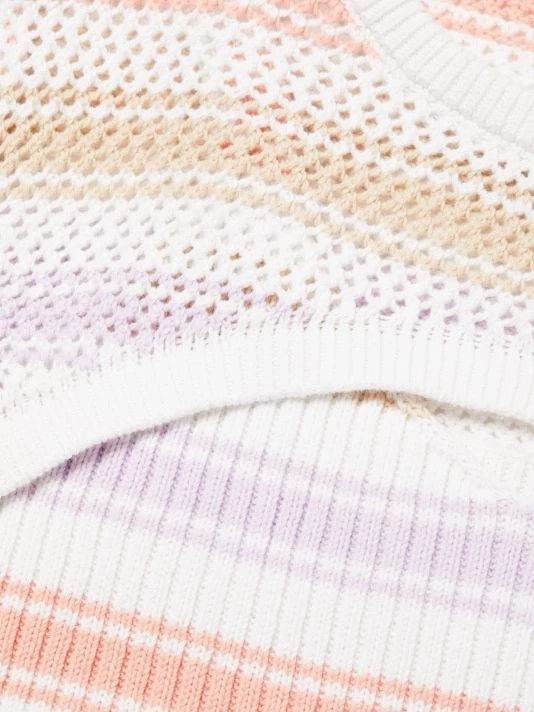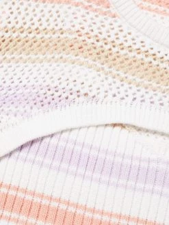This striped rib-knit tank top is complete with layered tonal crochet crewneck and sleeves.