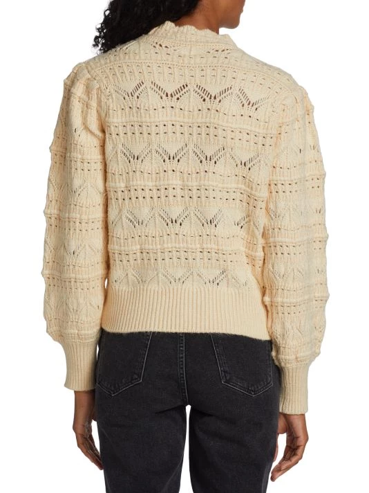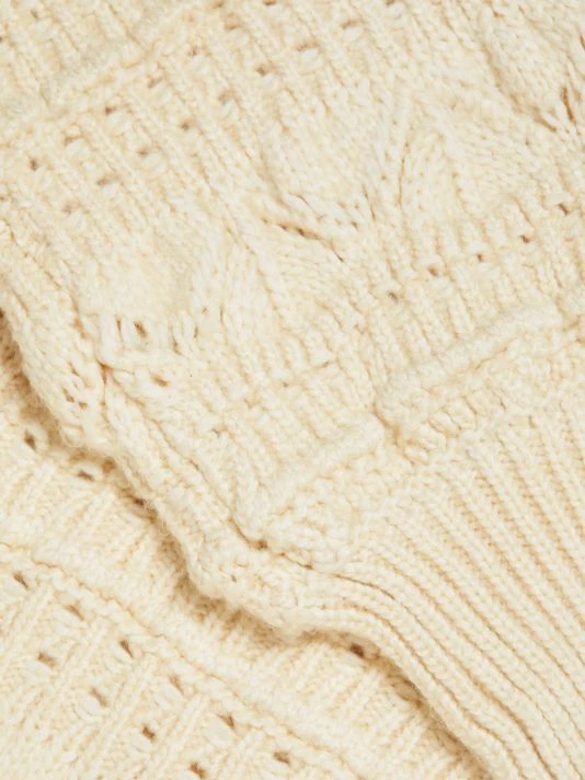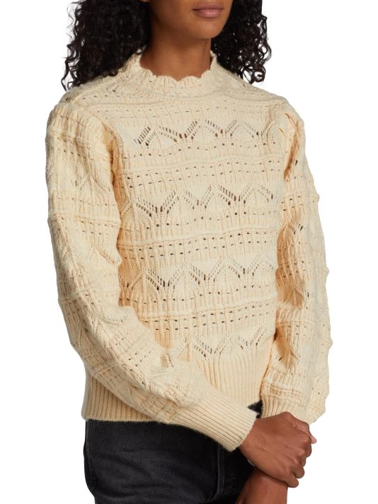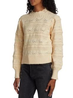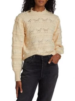 Eyelet patterning lends charming style to Design History’s textured scallop-trim sweater.
