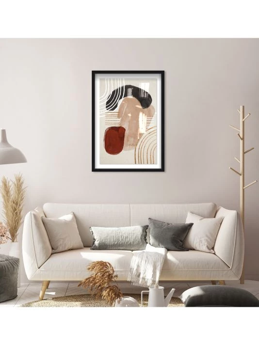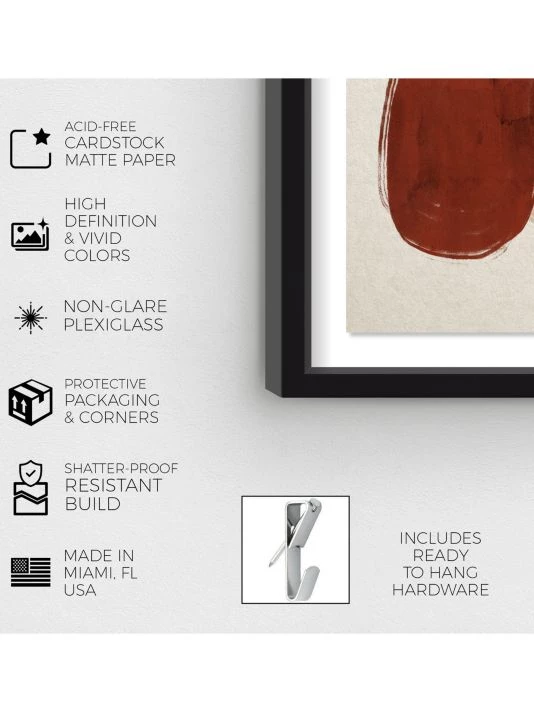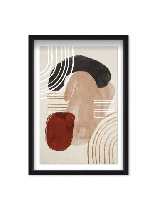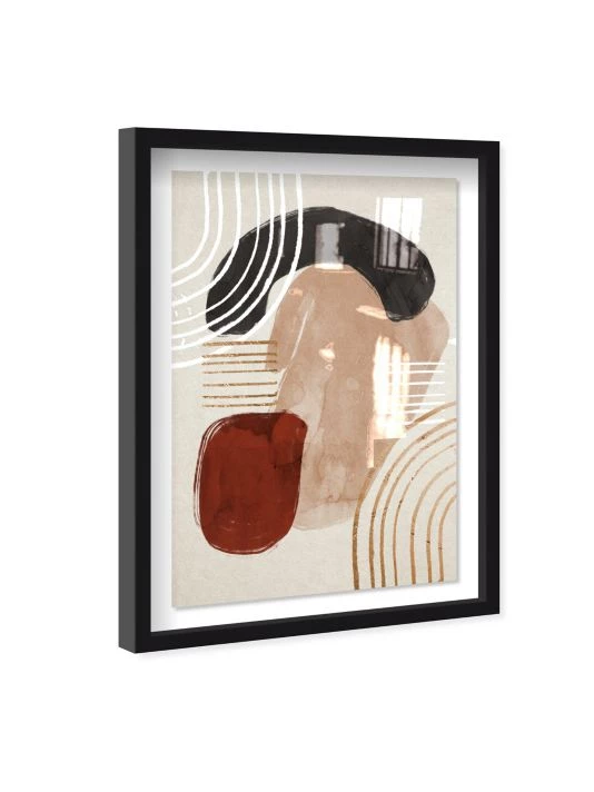 This print features a mid-century inspired graphic and is professionally mounted within a glossy black shadowbox frame.