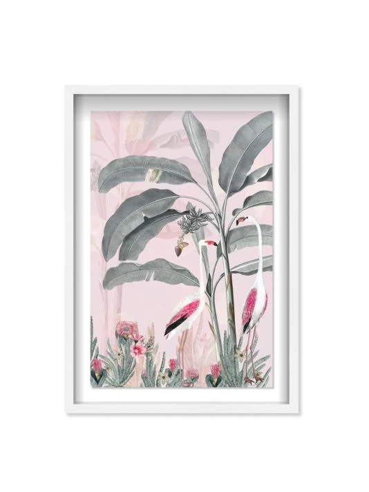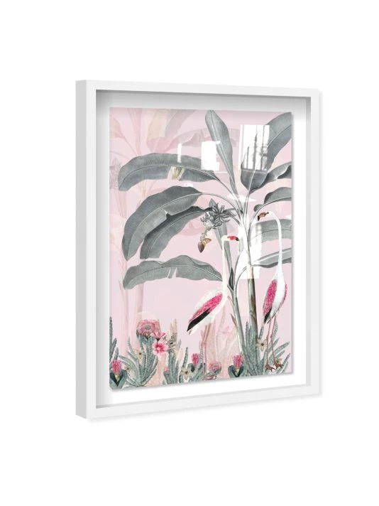 Featuring a stylized wildlife and chinoiserie-inspired motif, this floating art print is professionally mounted within a white shadowbox frame.