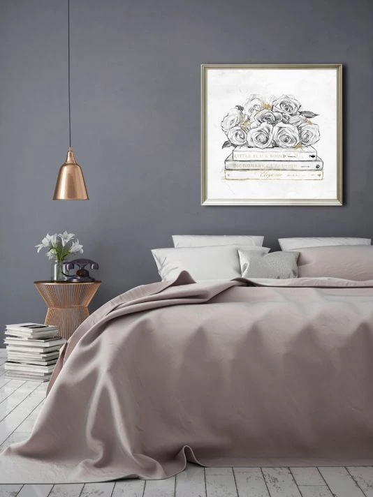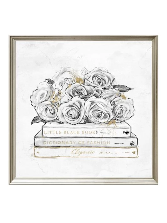 A bouquet of roses rests atop a stack of coffee table books in this chic print settled in a wooden frame.