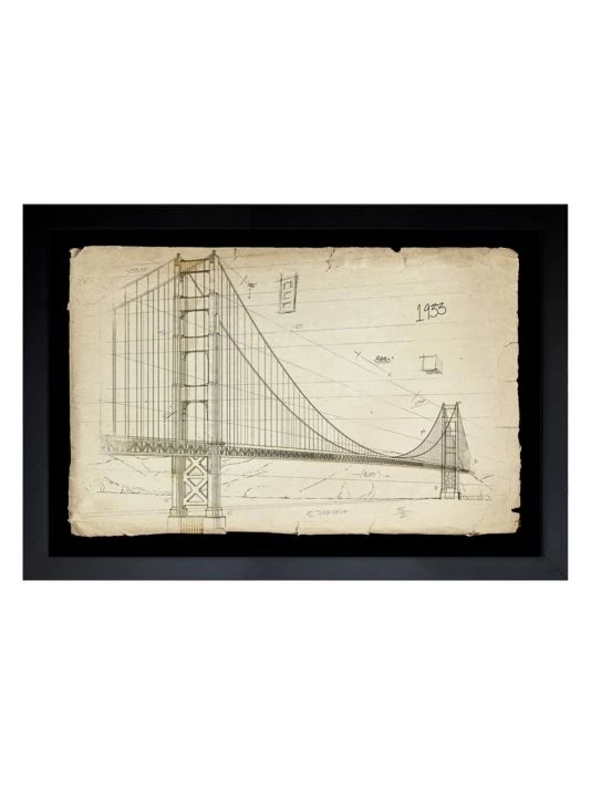 Framed vintage-inspired sketch of Golden Gate Bridge.