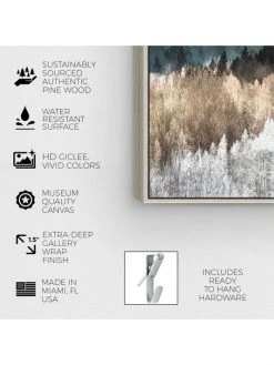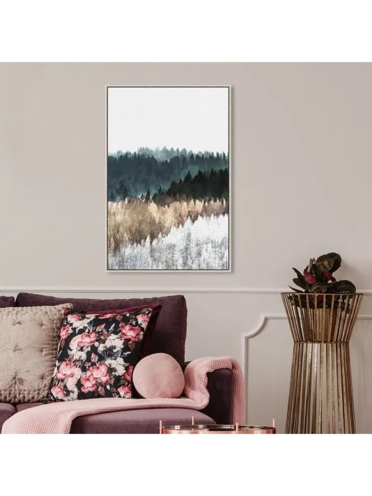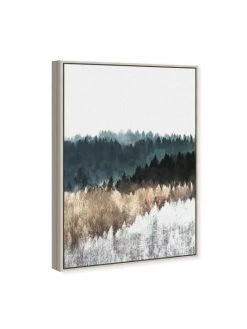 A painterly landscape adorns this canvas, hand-stretched across a wood backing and set within a floating frame.