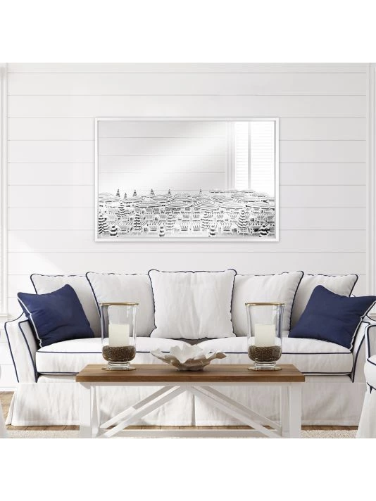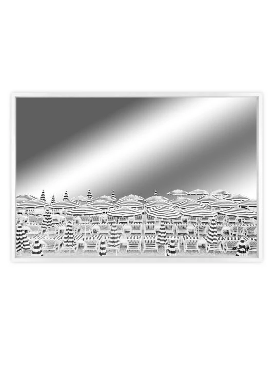 Equal parts mirror and work of art, this framed accent mirror radiates summer with its beach umbrellas design. Each piece is mounted and set deep within a painted wood frame.